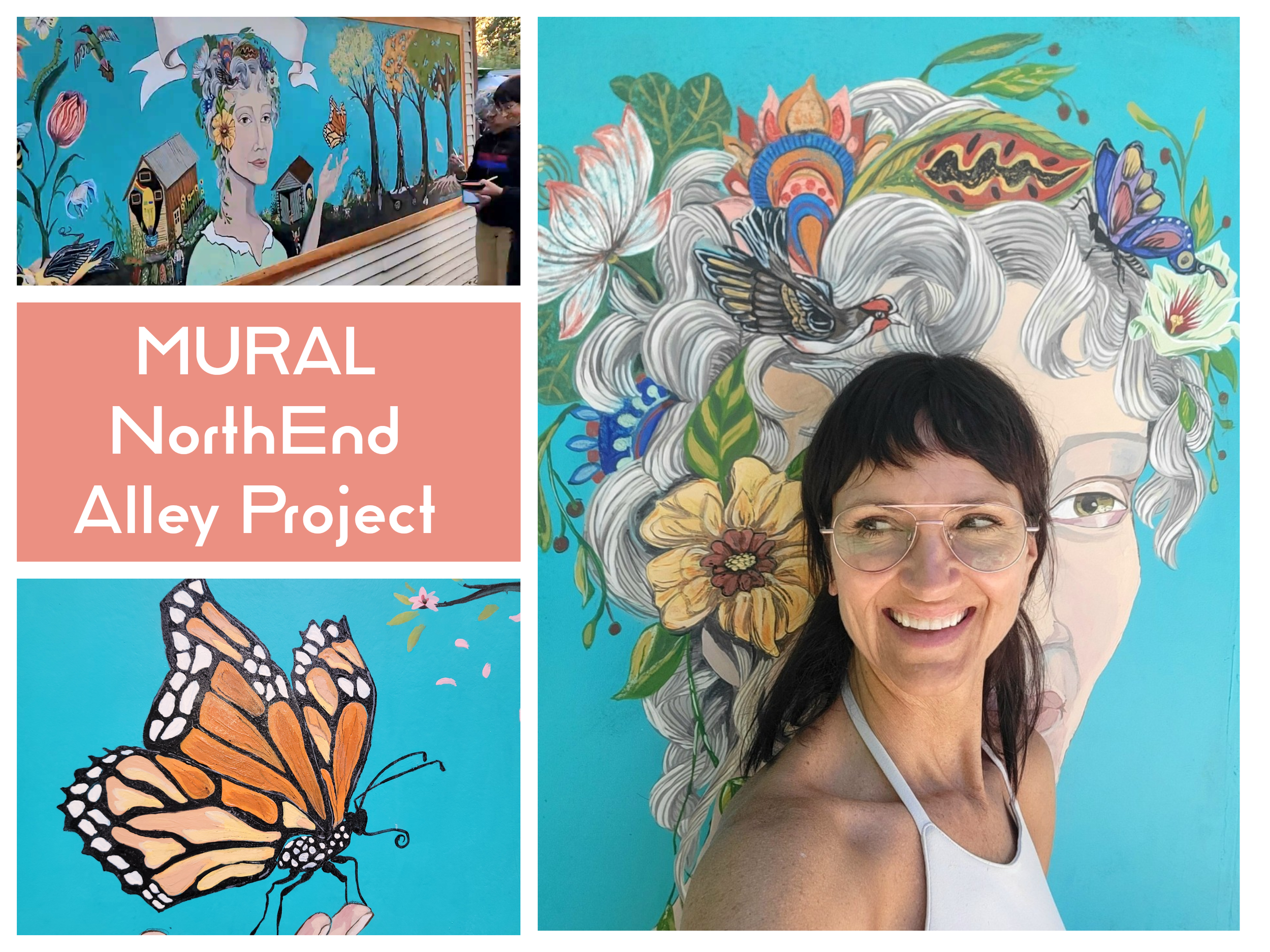 The Thatcher-O'Farrell Alley Project is located in the heart of Boise’s historic North End neighborhood. In the fall of 2023, Kim Bennett Porter completed a 18’ x 4’ mural dedicated to Gina Lockwood (champion of The Alley Project), her late partner “Jimmy Jet” and the variety of plants and animals that also call the alley home. In early 2022, at the prompting of Gina, residents of the alley agreed on a shared vision to turn its usable soil, odd shaped nooks, wonky fences and charming garage backsides into purposeful, inviting and communal spaces. Since then, community gardens have thrived, bearing two seasons of fruits, vegetables and herbs. An evolving children’s gallery of sculpture and art has been created under the direction of “the alley kids.” Colonies of bees have successfully become established and shared their honey. Community gatherings with live music, food and vendors have been enjoyed by local residents. Several new murals have been completed with more planned for the future.